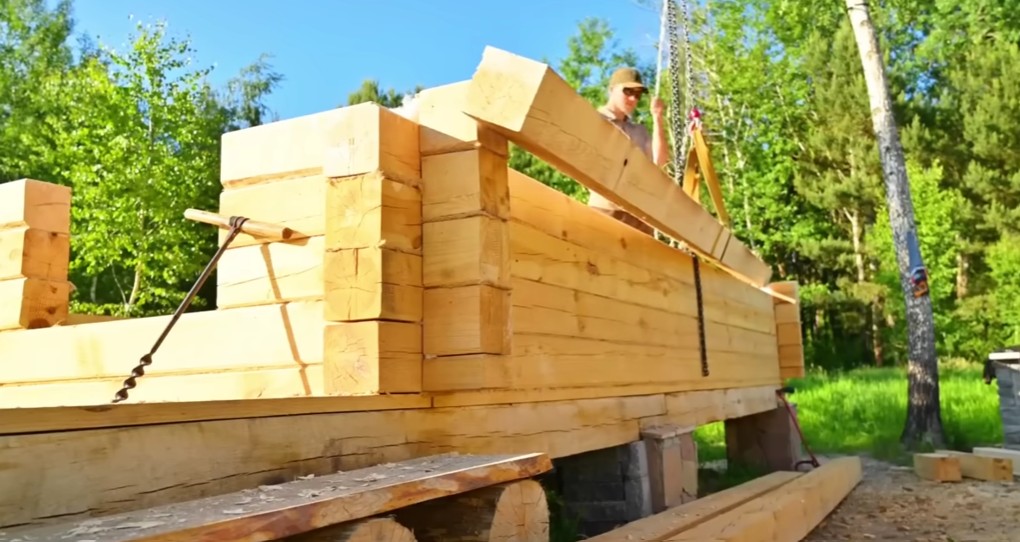 Těžké trámy zvedal pomocí jednoduchého kladkostroje upevněného ke stromu, aby je mohl bezpečně usadit na horní část rostoucí konstrukce srubu