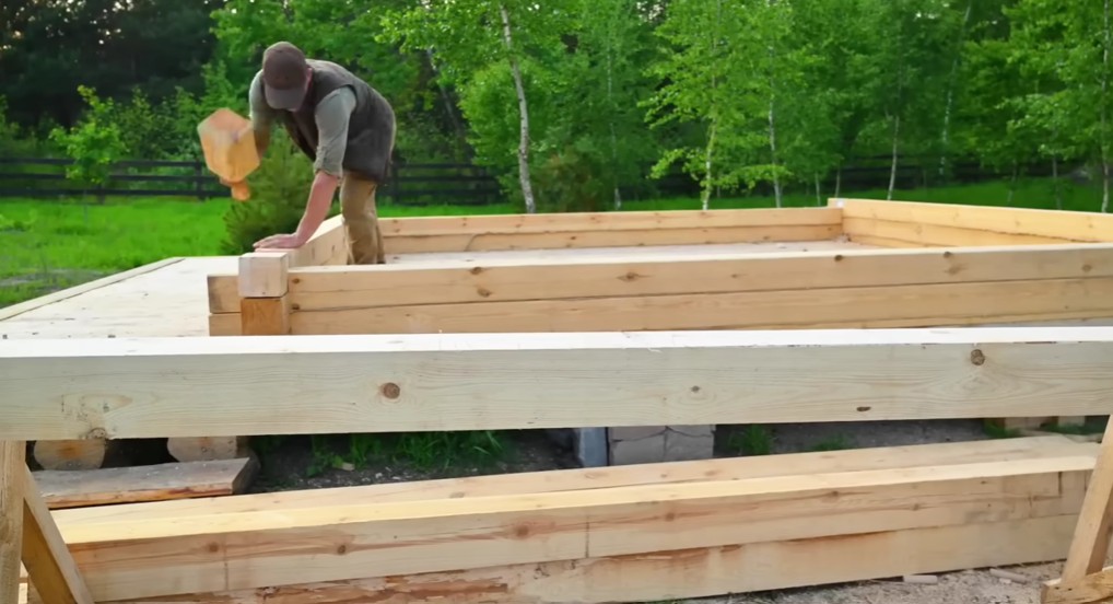 Trámy stěn postupně skládal na sebe a pomocí palice je usazoval do připravených spojů, aby jednotlivé vrstvy pevně zapadly a vytvořily stabilní srubovou konstrukci