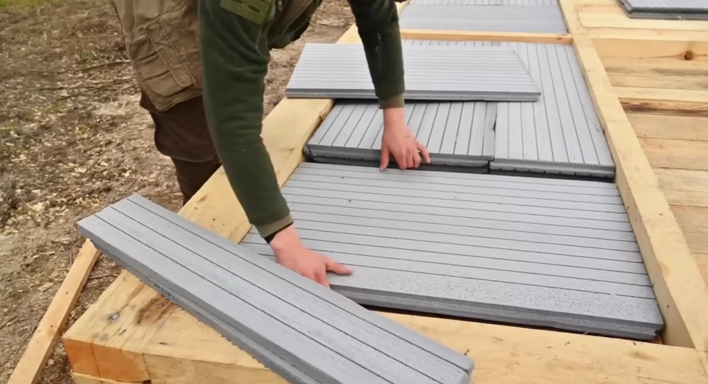 Na dřevěný základ pokládal izolační desky, které pomáhají chránit podlahu před chladem a vlhkostí přicházející ze země