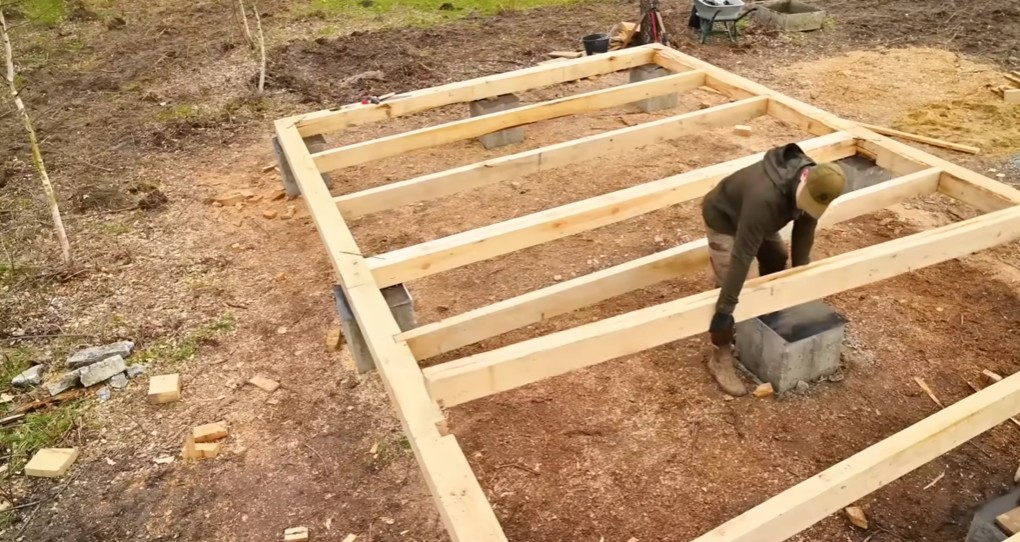 Po spojení všech trámů vznikl základní rošt podlahy, který rovnoměrně rozkládá hmotnost srubu na jednotlivé betonové patky zapuštěné v zemi
