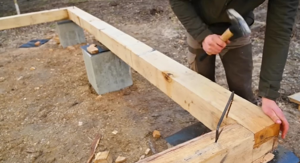 Jednotlivé trámy následně spojoval dlouhými hřebíky, aby vytvořil pevný rám podlahy, který rozkládá váhu celé stavby na betonové patky