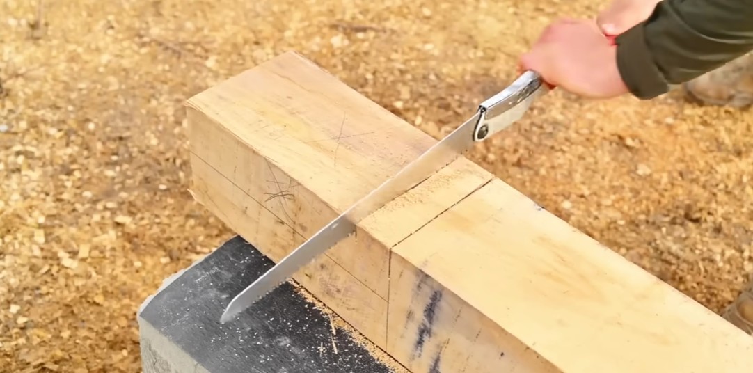 Nosné trámy musel nejprve přesně upravit pilou, aby do sebe jednotlivé části konstrukce zapadly a vytvořily stabilní základ budoucí podlahy srubu