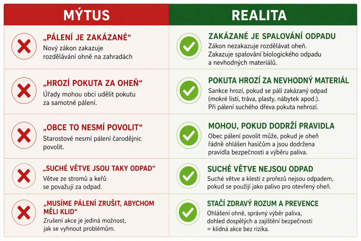 Přehledná tabulka ukazuje mýty a realitu ohledně zákazu pálení listí, větví a trávy