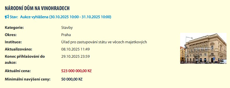 Nenechejte se vyděsit. Mezi prvními nabídkami totiž uvidíte něco, co si nejspíš nebudete moci dovolit. Vyskočí na vás například Národní dům na Vinohradech za 523 milionů