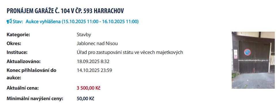 V nabídce je také pronájem garáže o výměře 17,95 m2. Garáž má samostatný elektroměr, betonovou podlahu a dřevěná vrata