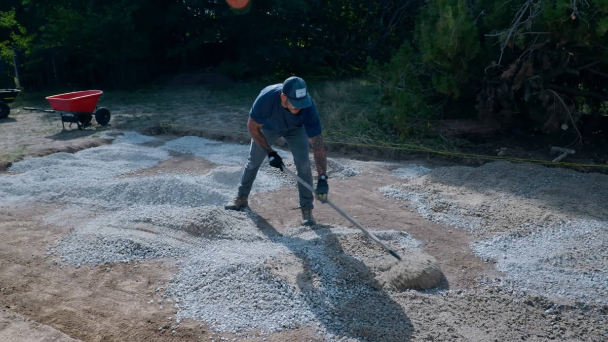 Pomocí hrábí upravíme terén a vyrovnáme plochu pro budoucí stavbu. Na tomto místě brzy vybudujeme masivní dřevěnou pergolu.