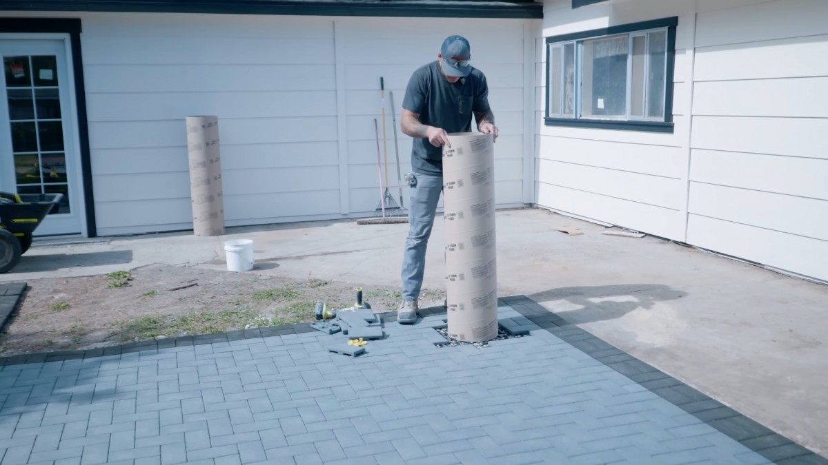 Otestujeme umístění papírové bednicí trubky o průměru 30 cm. Tento prvek nám poslouží jako přesná forma pro lití betonových základů sloupů.