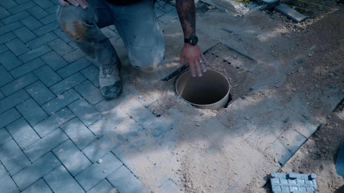 Do kompletně začištěného výkopu opatrně zasuneme papírovou bednicí trubku o průměru 30 cm. Ta nám poslouží jako forma pro lití betonu.