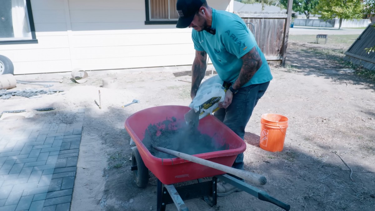 Do kolečka vsypeme zbytek suché směsi a následně přilijeme vodu. Důkladně pohlídáme mísící poměr pro dosažení ideální pevnosti betonu.