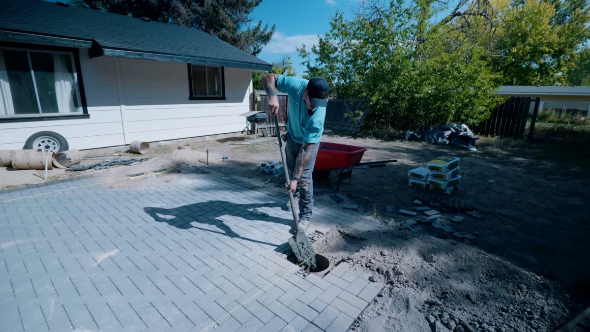 Zednickou motykou pečlivě smícháme vodu s betonovou směsí. Hmotu dokonale propojíme, aby v ní nezůstala žádná sypká a suchá místa.