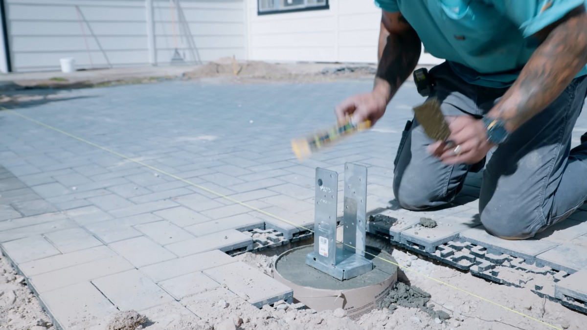 Přesnost usazení kotvy ihned zkontrolujeme pomocí malé vodováhy. Sebemenší nepřesnost by se výrazně projevila na rovinnosti pergoly.