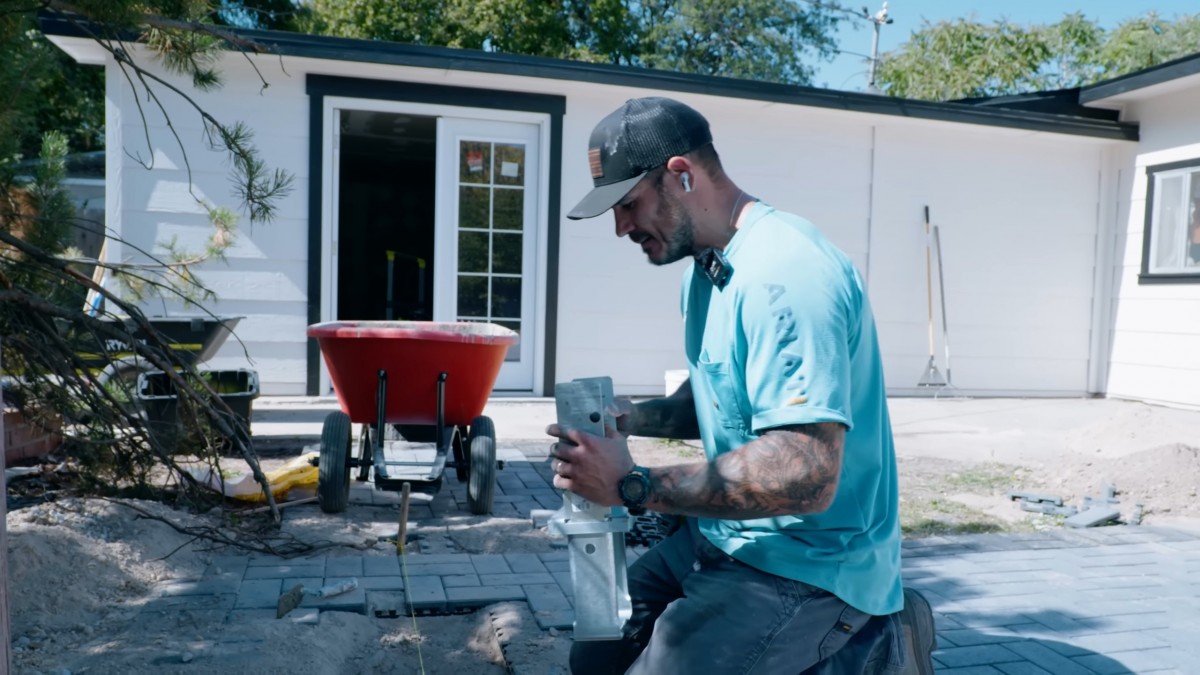 Připravíme kotevní patku k finálnímu usazení. Abychom zaručili naprostou rovinnost všech sloupů pergoly, budeme se řídit vodicí šňůrou.