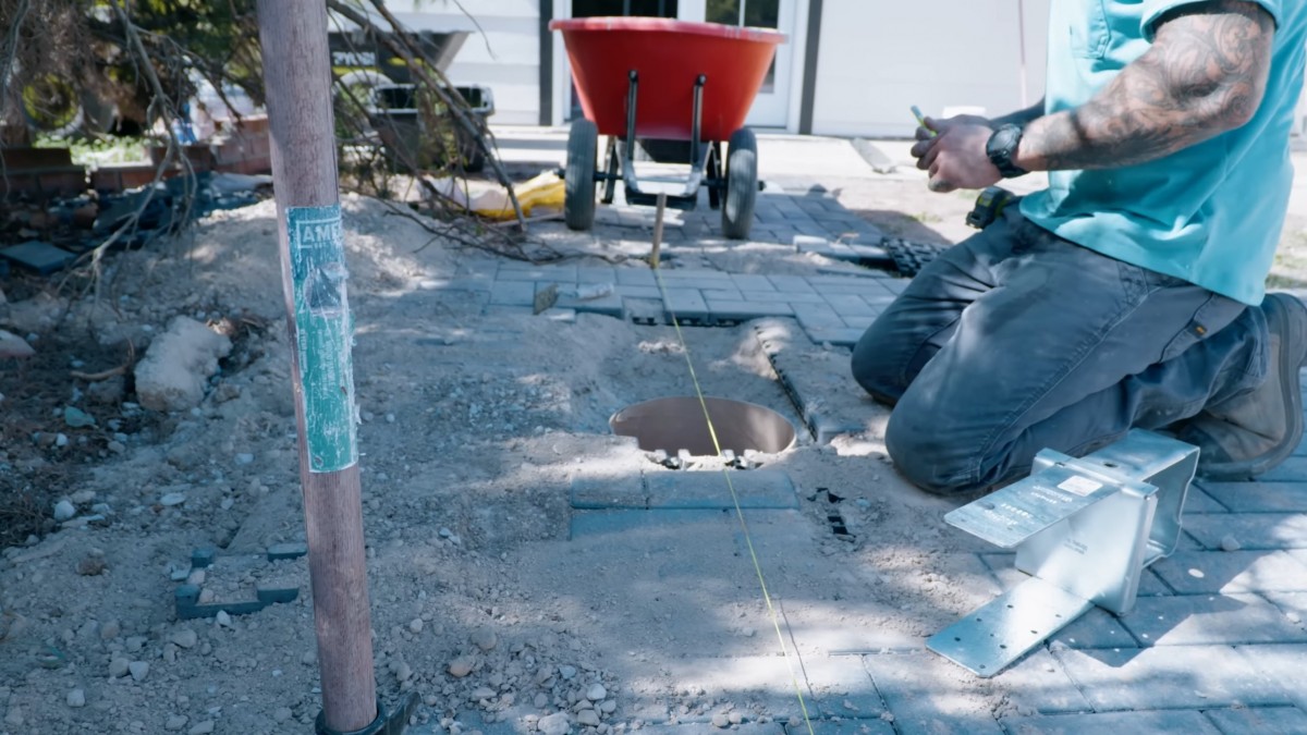 Zednickou lžící přihrneme beton pod kovovou kotvu pro její dokonalé podepření. Jakmile směs vytvrdne, základy naší pergoly budou hotové.
