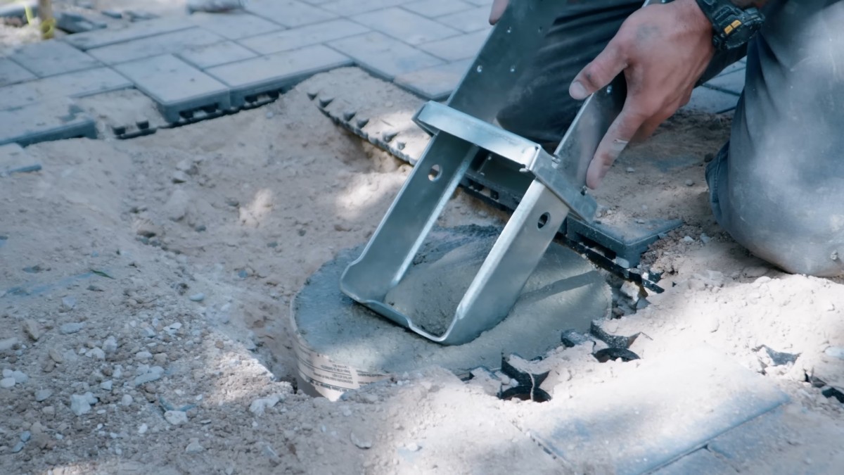 Pomocí malé vodováhy pečlivě zkontrolujeme sklon ocelové patky. Je nutné zajistit naprostou rovinnost pro ukotvení sloupů naší budoucí pergoly.