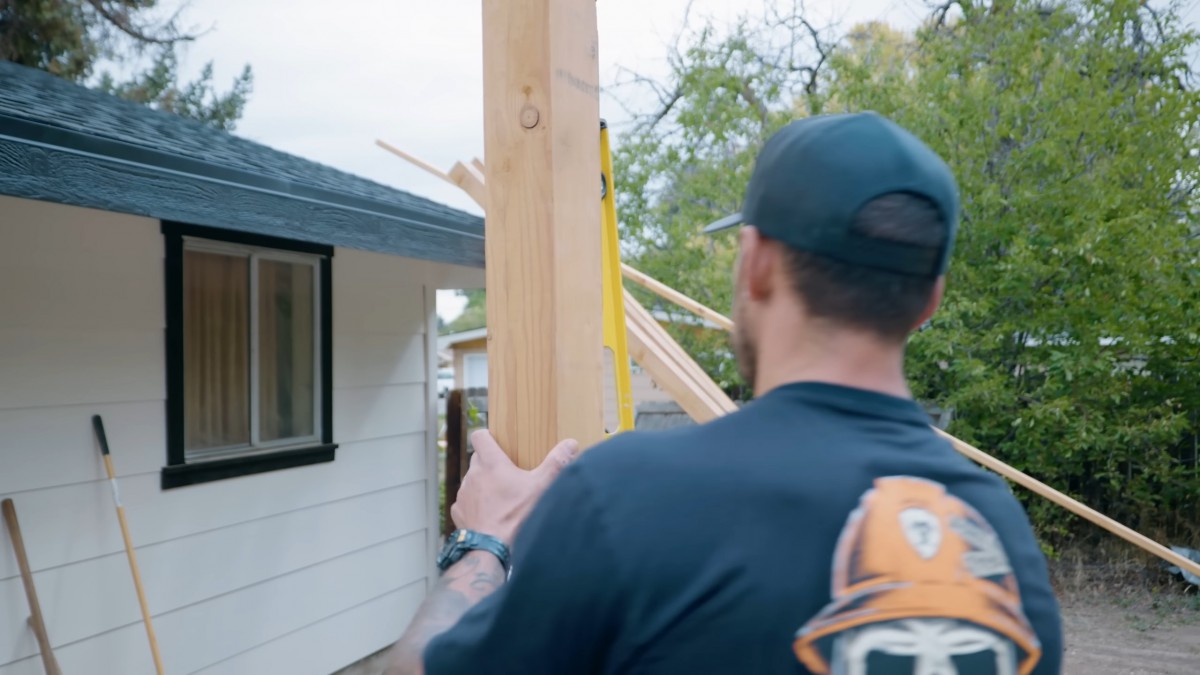 První nařezaný nosný sloup nasadíme přímo do připravené ocelové patky. Tímto důležitým krokem zahájíme samotnou montáž hlavní dřevěné konstrukce.