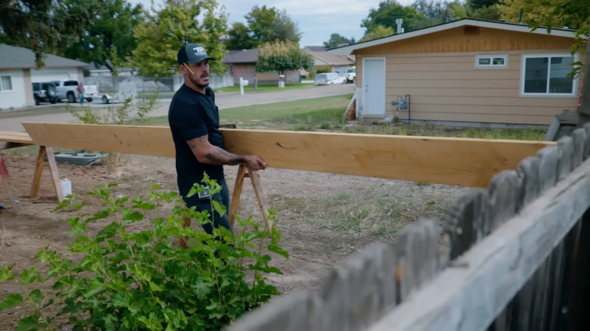Ručně přeneseme další mohutný nosník na místo určení. Tyto dlouhé a těžké střešní prvky tvoří hlavní zátěžovou strukturu celé dřevěné stavby.