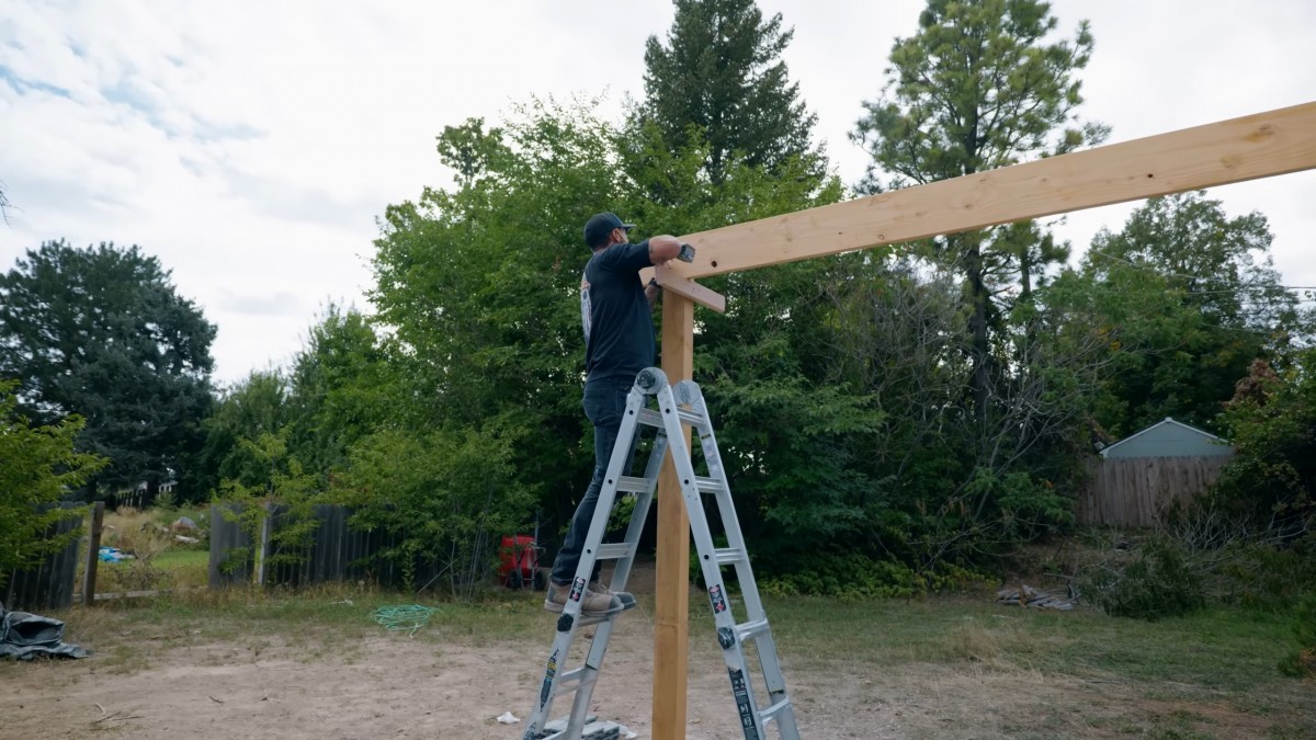 Zkompletujeme pevné uchycení zadní části střešního prstence pergoly. Tímto krokem zajistíme dokonalé svázání celé dřevěné nosné konstrukce.