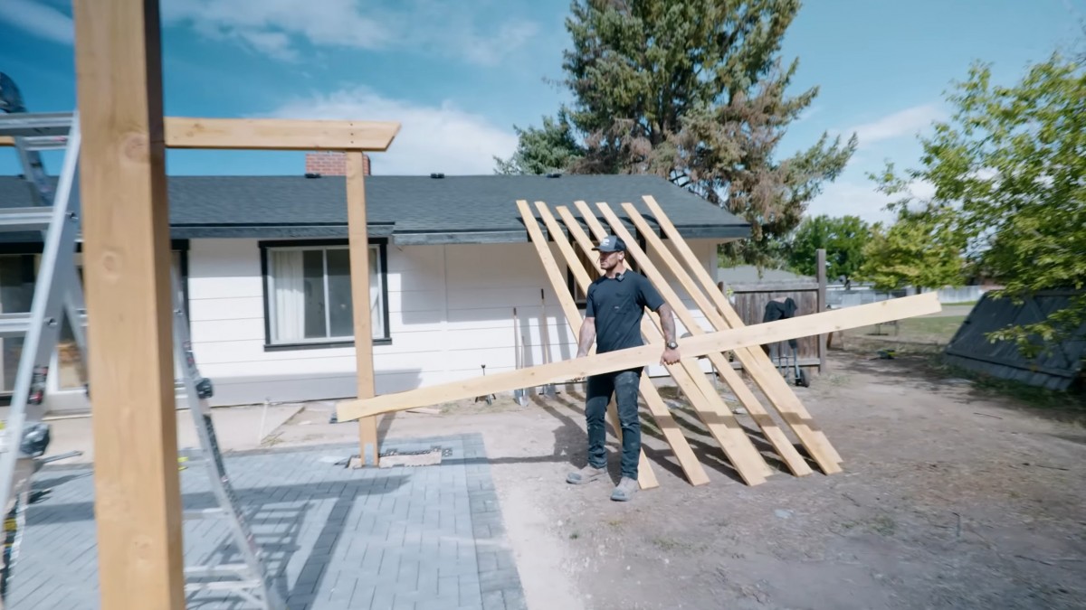 Přineseme první fošny o průřezu 5x15 centimetrů. Z těchto profilů postupně vytvoříme hlavní střešní rošt pro dokonalé zastínění naší pergoly.