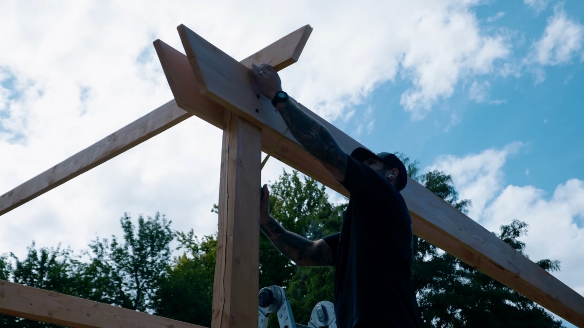 Dlouhou fošnu opatrně vyzdvihneme na připravenou nosnou konstrukci. Tyto příčné trámy zajistí celkovou tuhost a propojení obou stran stavby.