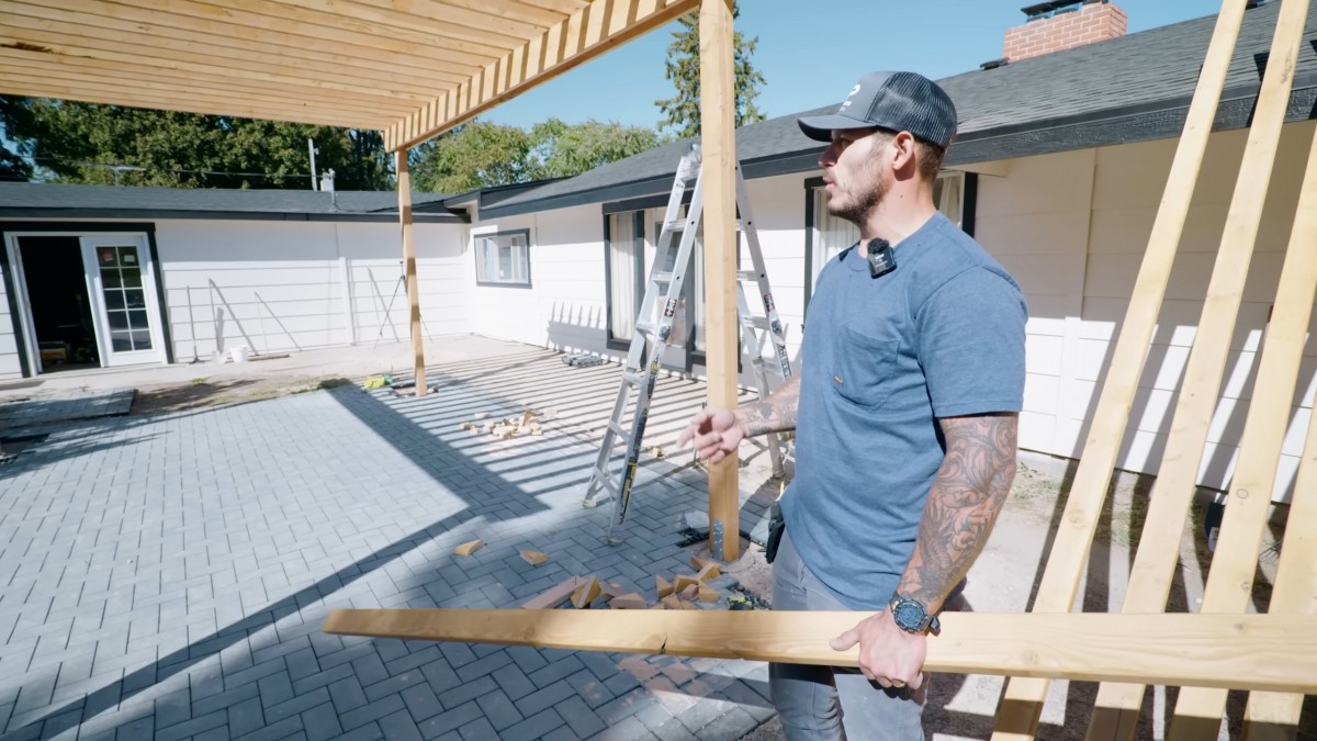 Přineseme si užší latě o rozměrech 5x10 centimetrů. Z těchto profilů následně vytvoříme finální horní vrstvu pro dokonalé stínění terasy.