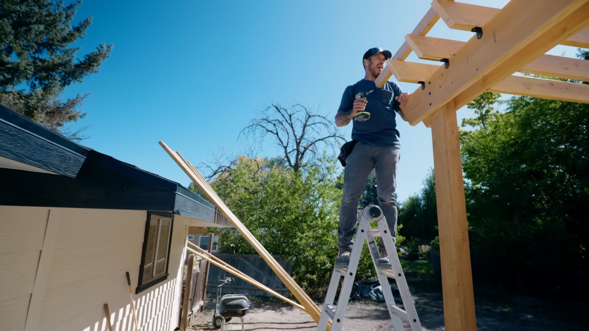 Bezpečně připevníme první z finálních krycích latí. Tímto krokem zahájíme tvorbu charakteristického žebrování naší nové dřevěné pergoly.