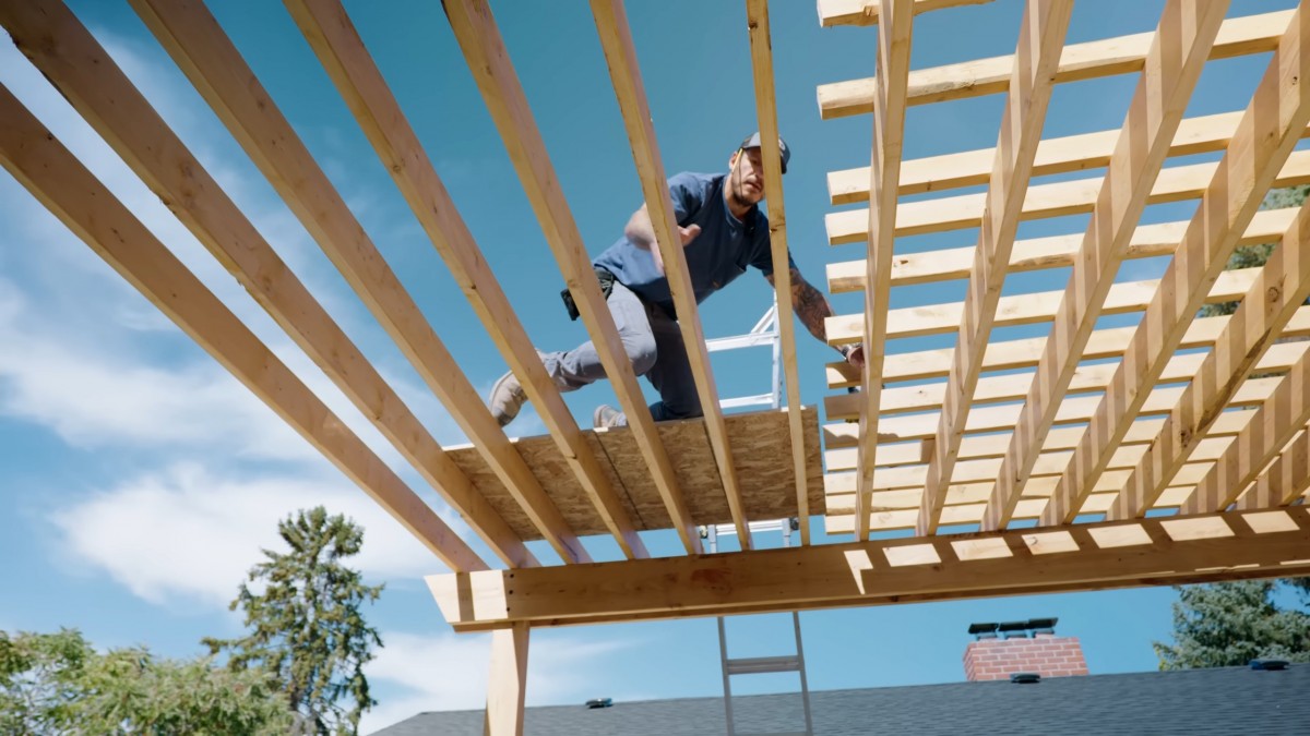Z plošiny ukotvíme latě uprostřed konstrukce. Práce shora je mnohem bezpečnější a efektivnější než neustálé posouvání štaflí kolem pergoly.