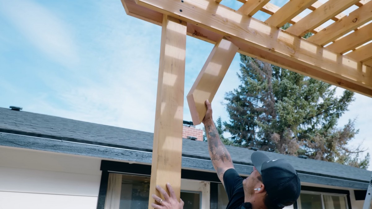 Připravíme si rohové zpevňovací vzpěry z masivního dřeva. Tyto dekorativní prvky výrazně zvýší boční tuhost celé naší pergoly.
