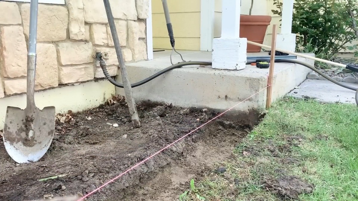 Pomocí rovného rýče se přesně podél vodicího provázku začíná hloubit příkop pro základ zídky.