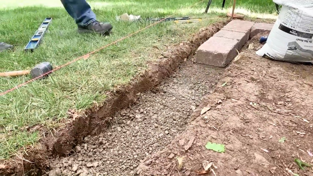 První blok se pečlivě srovnává podle napnuté vodicí linky a pro jemné poklepání a korekce výšky je připravena gumová palička.