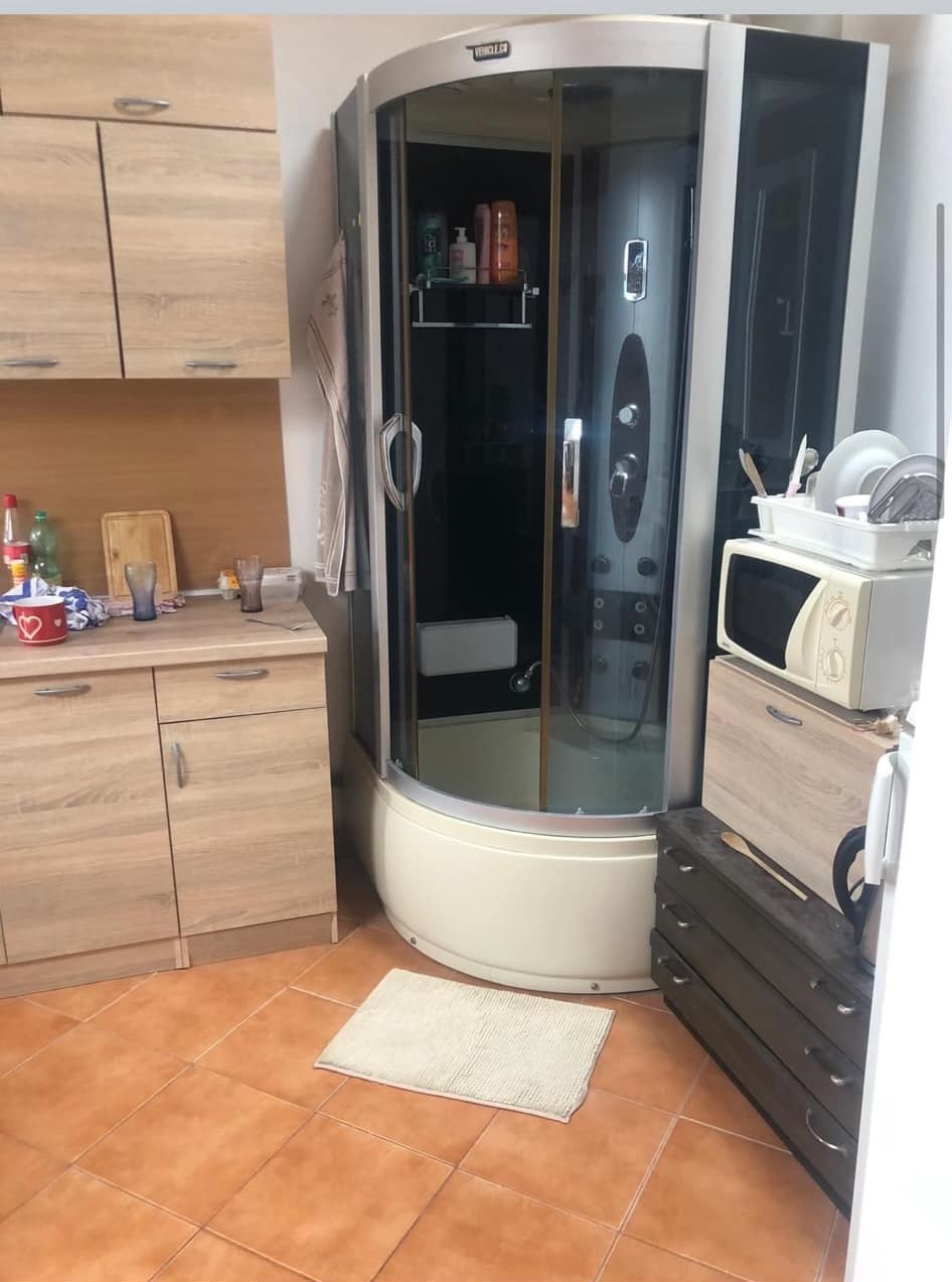 Wellness a gastro v jednom. Tady si můžeš dát sprchu, ohřát svíčkovou a uklidit nádobí, aniž bys udělala jediný krok