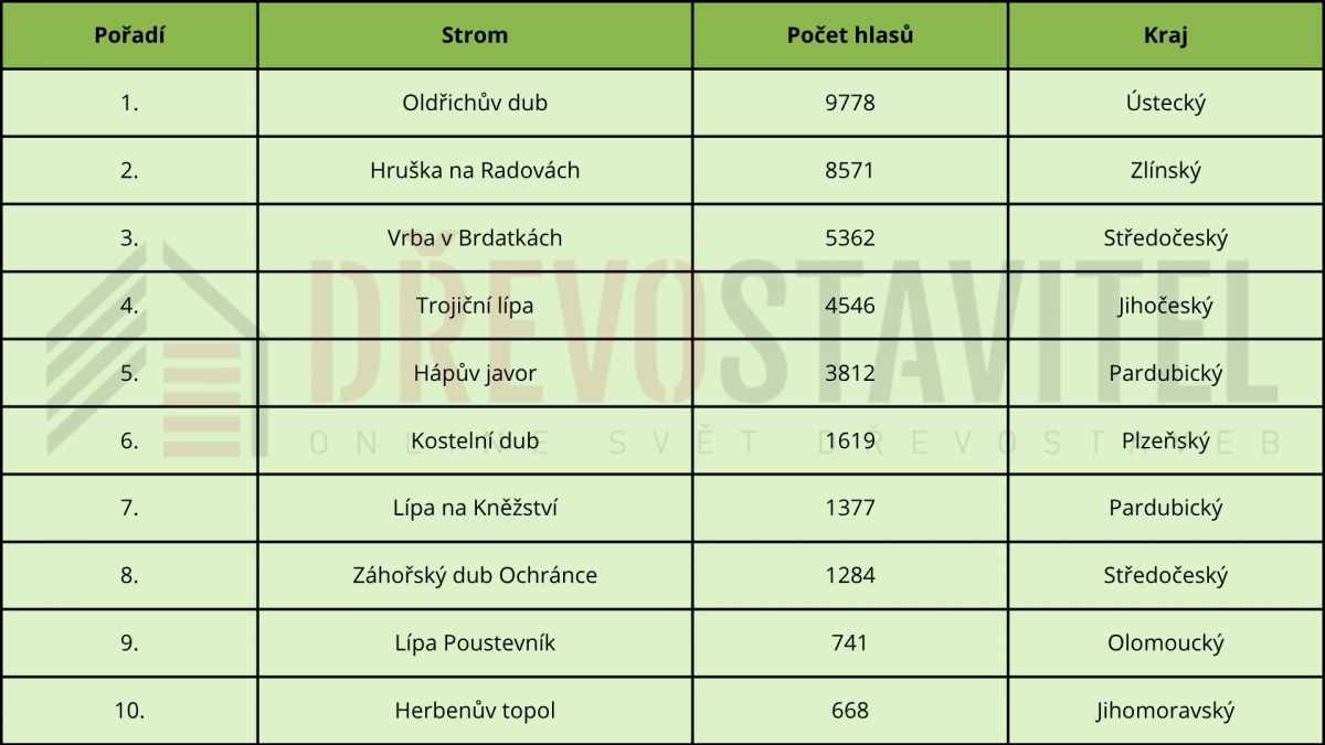 Oldřichův dub, který nominovaly Ivana Hluštíková a Jitka Kržová společně s dětmi z Lesního klubu Kořínek, v anketě nasbíral 9778 hlasů, a obsadil tak první příčku. Druhé místo obsadila Hruška na Radovách ze Zlínského kraje. Strom nominovaný folklorním souborem z Míkovic získal v anketě 8 571 hlasů. Vítězné trio uzavírá Vrba v Brdatkách ze Středočeského kraje. Strom, který v anketě získal 5 362 hlasů, nominovala Marcela Bergerová společně s komunitou z Talichovského údolí. Kompletní výsledky ankety jsou k dispozici také na webových stránkách ankety.