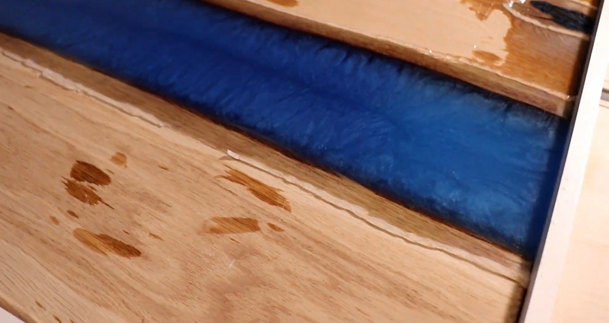 Epoxid pomalu zaplňuje prostor mezi dřevem. Vzniká ikonická řeka.