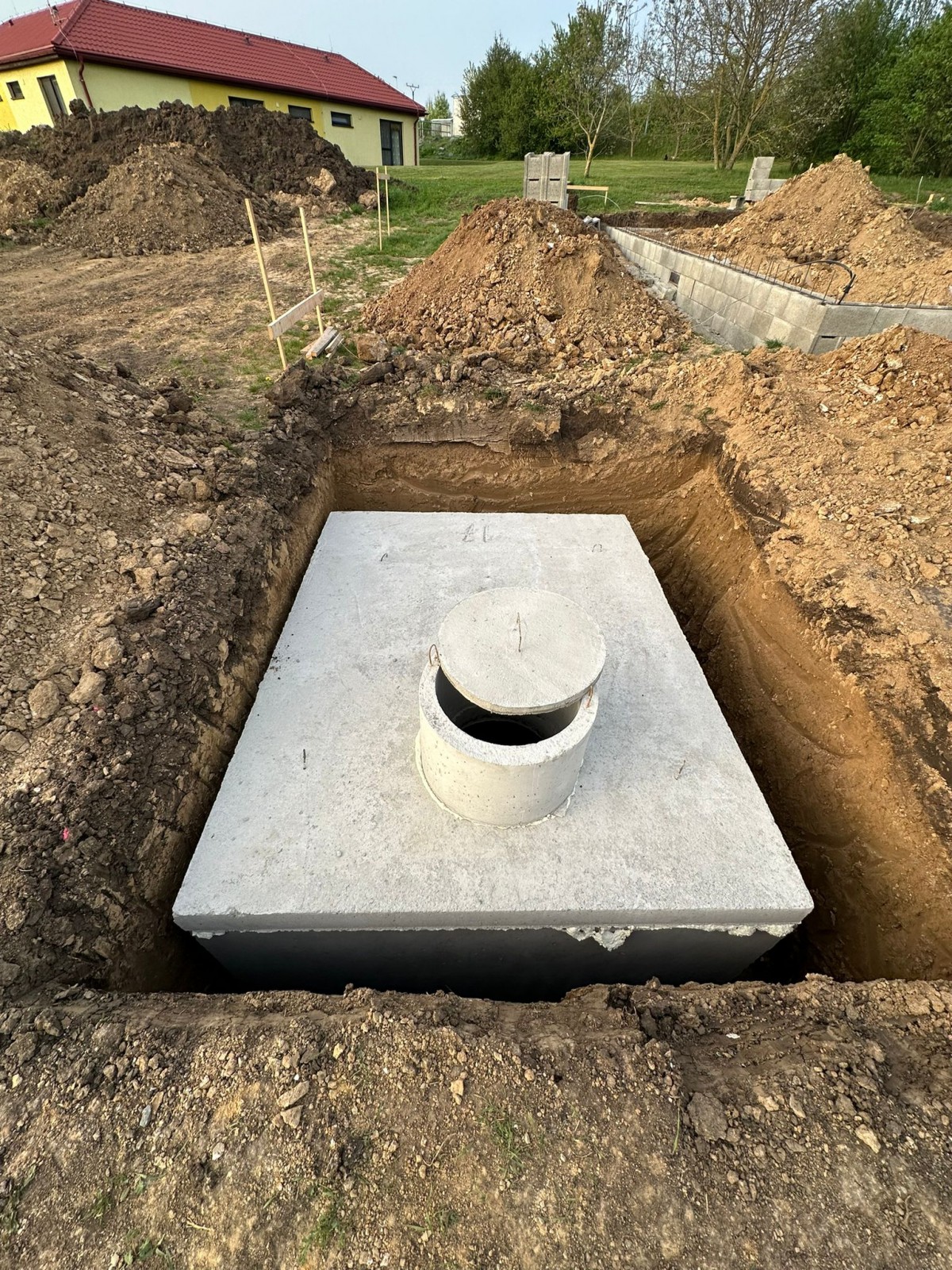 Retenční nádrž se skládá z poklopu, komína, desky a samotné žumpy (nádoby)