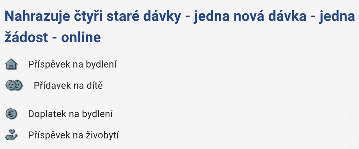 Superdávka postupně nahradí čtyři původní dávky, tedy příspěvek na bydlení, doplatek na bydlení, přídavek na dítě a příspěvek na živobytí