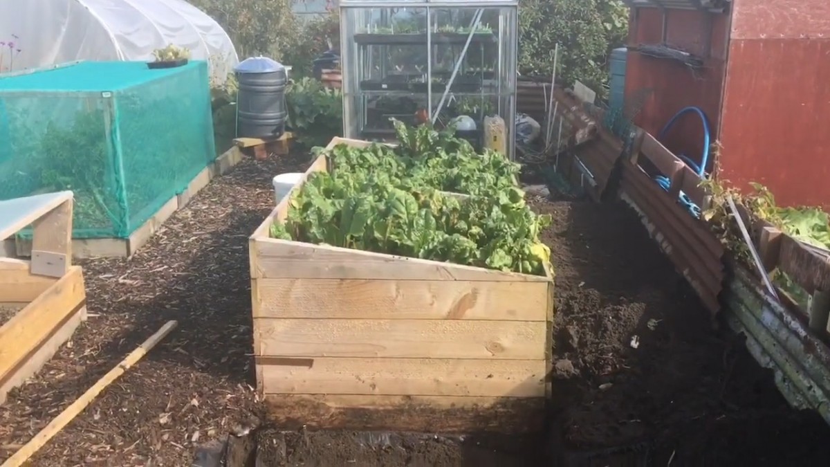 Teplý záhon na zemi plný zeleniny, připravený chránit rostliny před mrazíky. Pod vrstvy hnoje a kompostu se vytváří biologické teplo