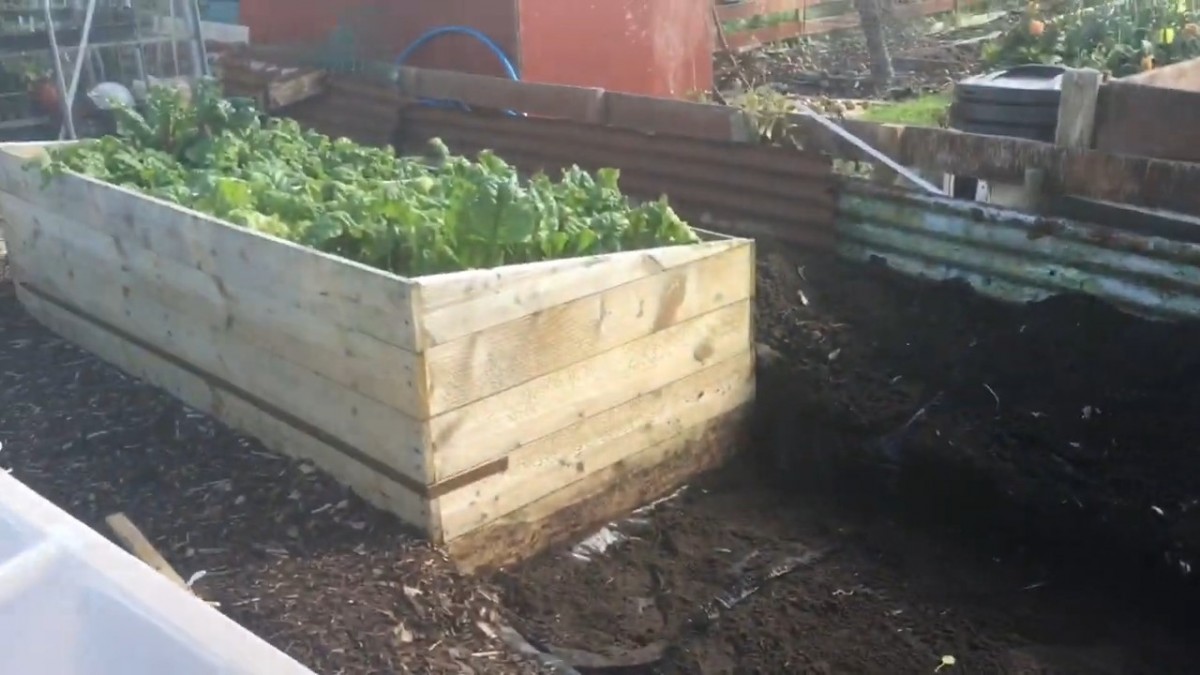 Hotový teplý záhon se zeleninou a vrstvou kompostu. Zajišťuje stabilní teplotu půdy během chladných nocí