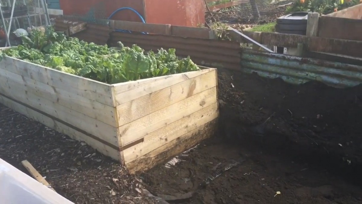 Pohled na plně osazený záhon, připravený chránit rostliny před mrazem. Každá vrstva podporuje biologický rozklad a uvolňování tepla