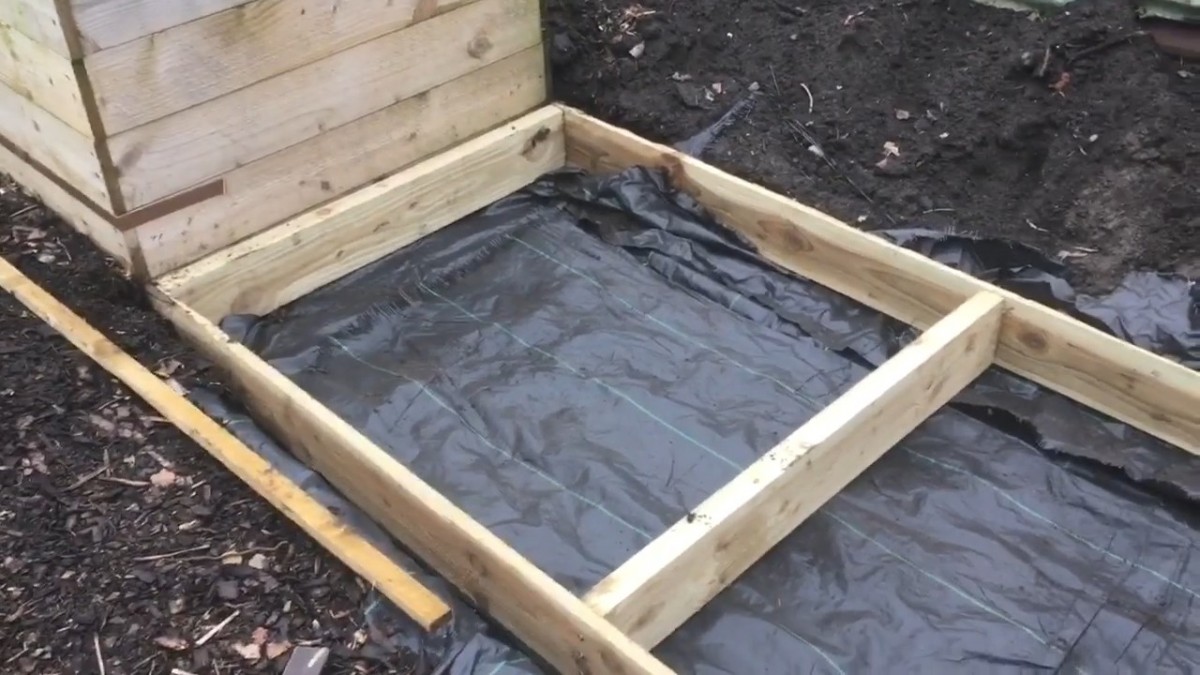 Celkový pohled na rám záhonu vystlaný fólií. Připravený k vrstvení hnoje a kompostu pro ranou a bohatou sklizeň