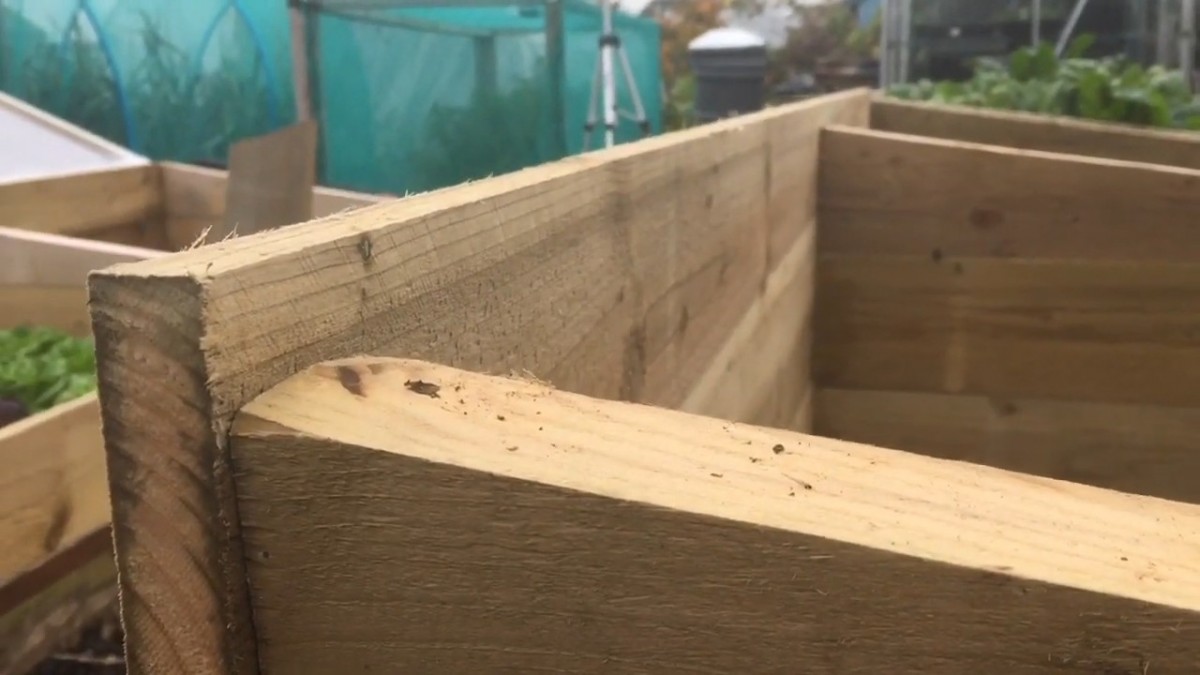Detail rohu rámu teplého záhonu připraveného na vrstvy hnoje a kompostu. Podklad pomáhá udržovat stabilní mikroklima pro sazenice