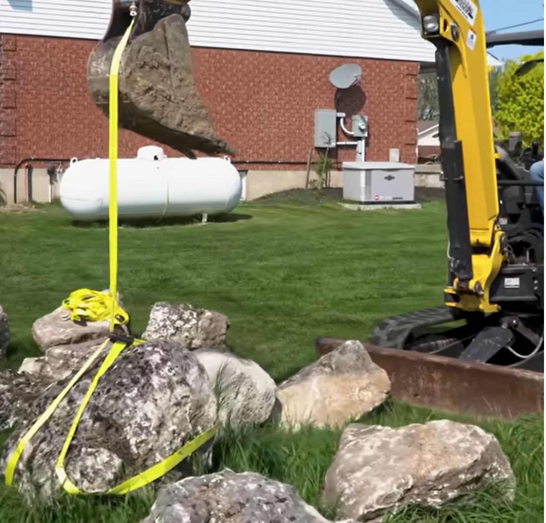 Využití bagru ke zvedání extrémně těžkých kamenů pro jejich přemístění do termálního jezírka