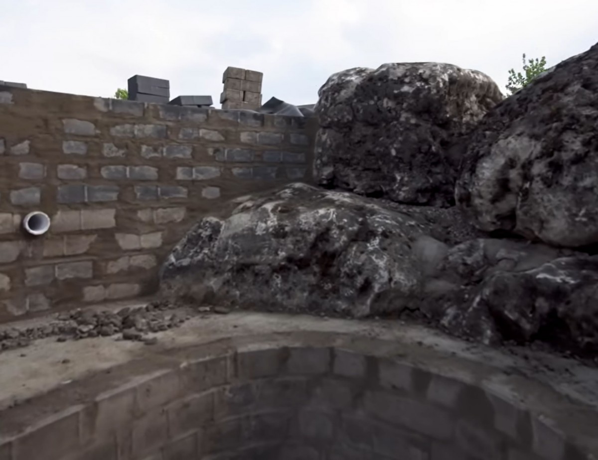 Hotová zídka jezírka navazující na přírodní kameny, které si přivezl na pozemek