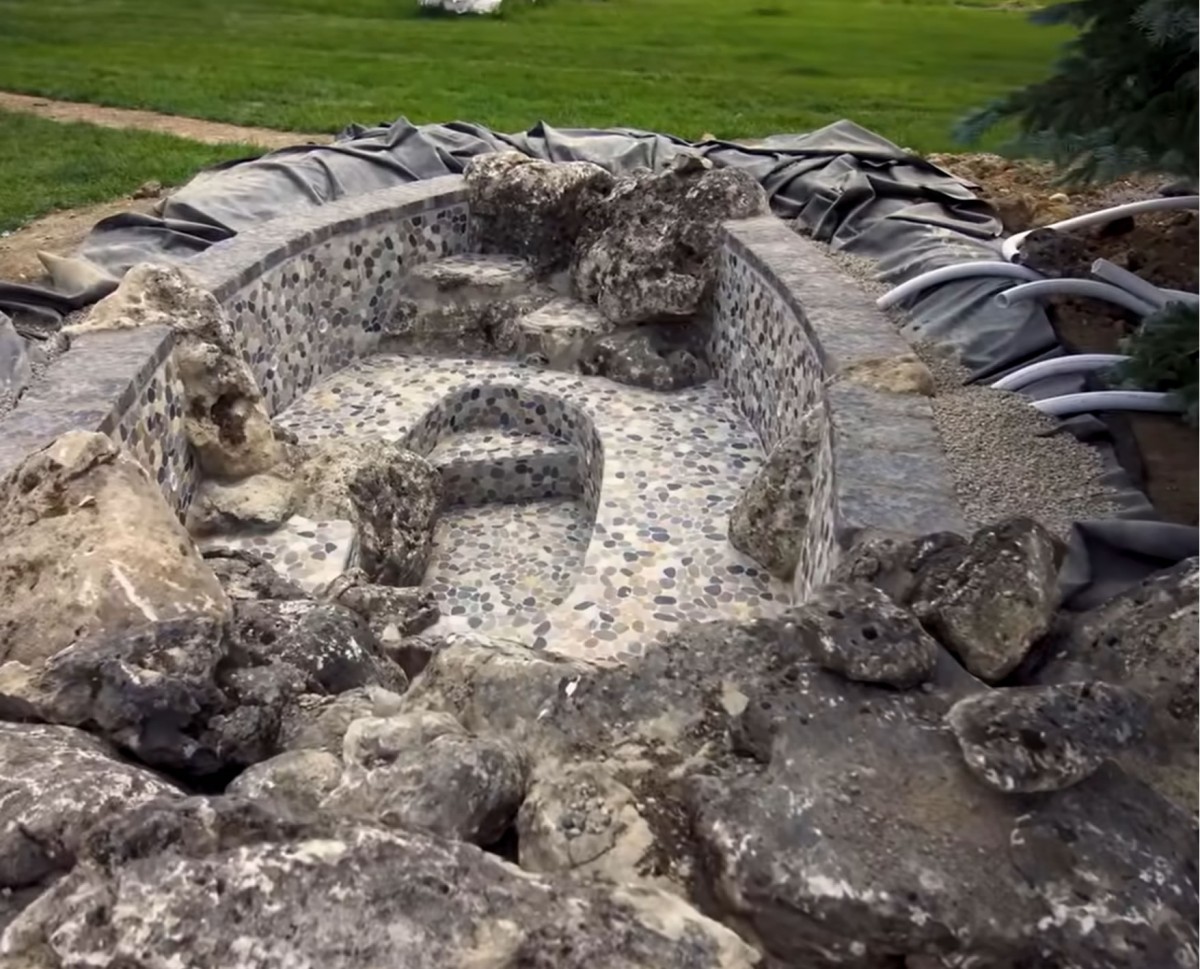 A zde je výsledek, pohled na termální jezírko poté, co byly nainstalovány okrasné oblázky