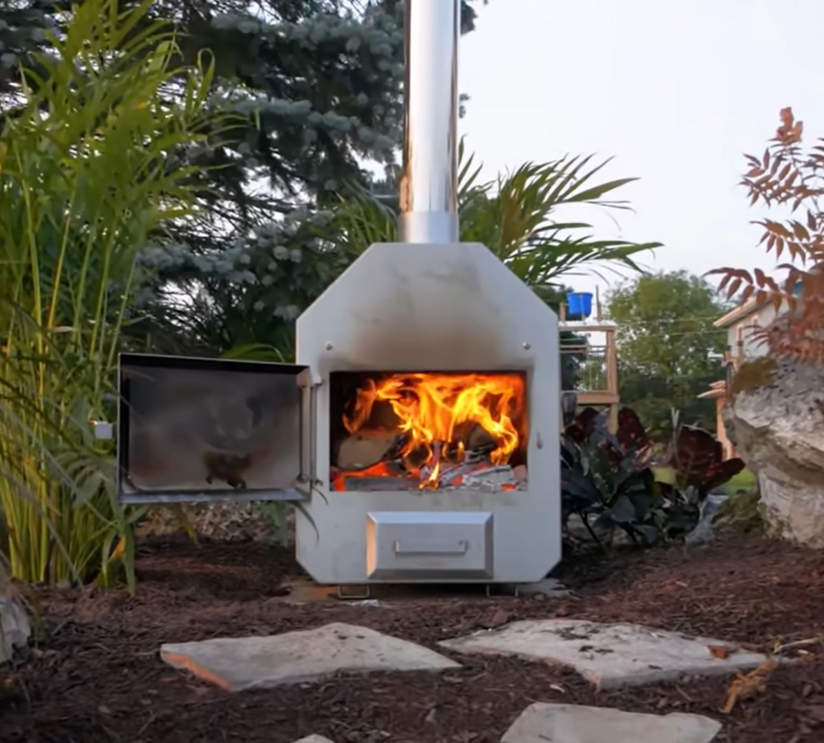 Kamna na dřevo, která ohřívají vodu pro termální jezírko, které si postavil svépomocí na zahradě