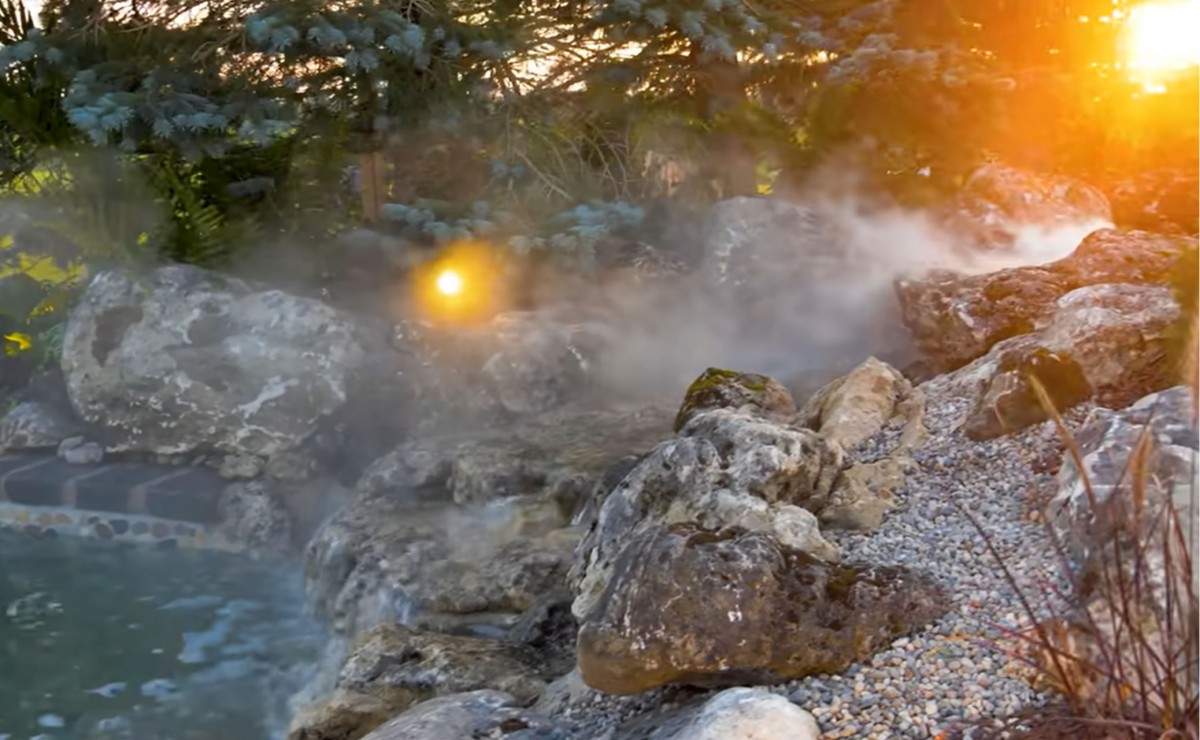 U jezírka, které vybudoval rodičům na zahradě, je i přítok horké vody formou jednoduché kaskády