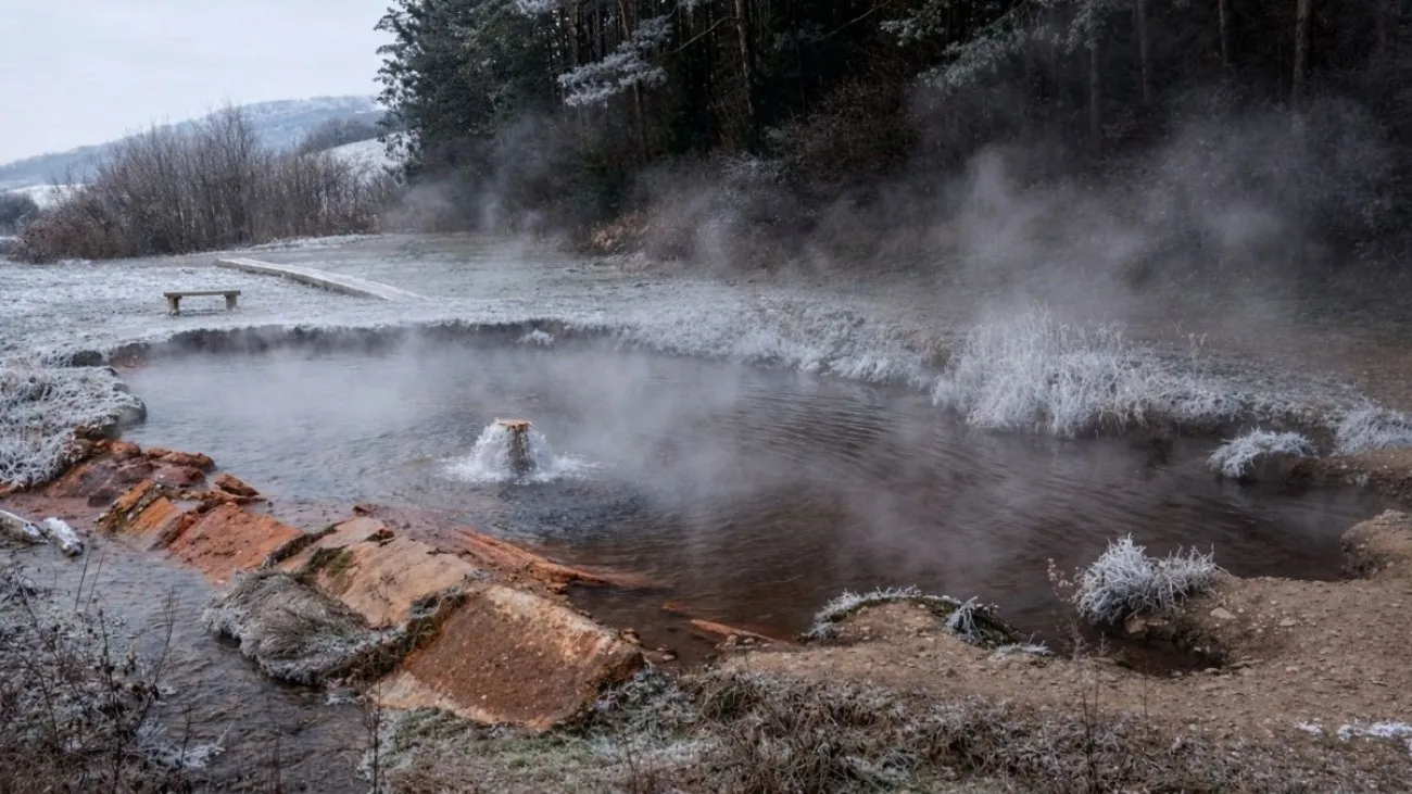 V roce 1991 byl vyhlouben umělý termální vrt hluboký 500 metrů, odkud proudí voda bohatá na minerály. Společně s vrtem bylo vybudováno i půl metru hluboké termální jezírko, které umožňuje koupání i mimo sezónu. Geotermální voda v něm jde cítit po síře, avšak ne natolik, aby to někomu bylo silně nepříjemné. Zápach navíc vykompenzují léčivé účinky vody, která má blahodárný vliv především na pohybový aparát. Kromě síry je zde obsažen také vápník a hořčík. Voda má oranžovou až červenou barvu, která v zimních měsících kontrastuje s krásnou bílou krajinou.