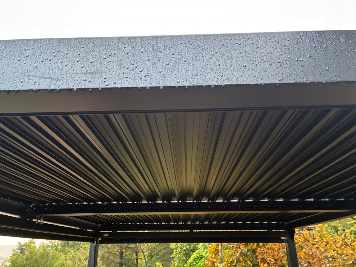 Lamely ve střeše pergoly lze nastavit na otevřeno nebo zavřeno, podle toho, jaké je počasí