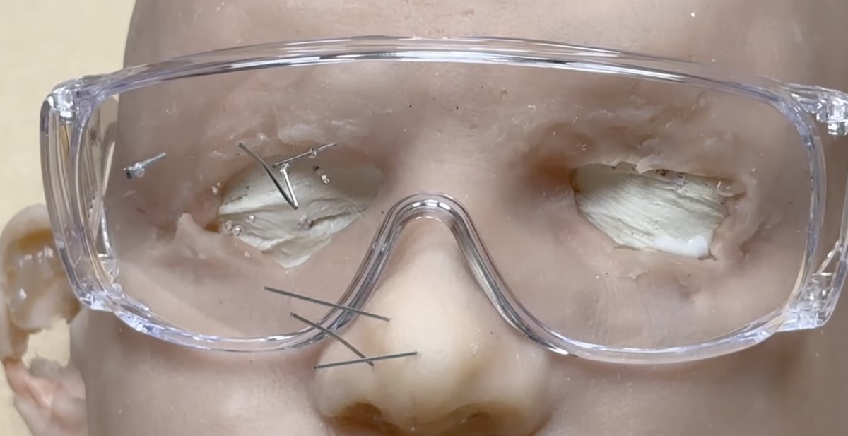 Při extrémním testu průrazu uzavřených ochranných brýlí se ukázalo, že ani tento typ konstrukce nedokázal zabránit průniku vystřelených pinek směrem k očím