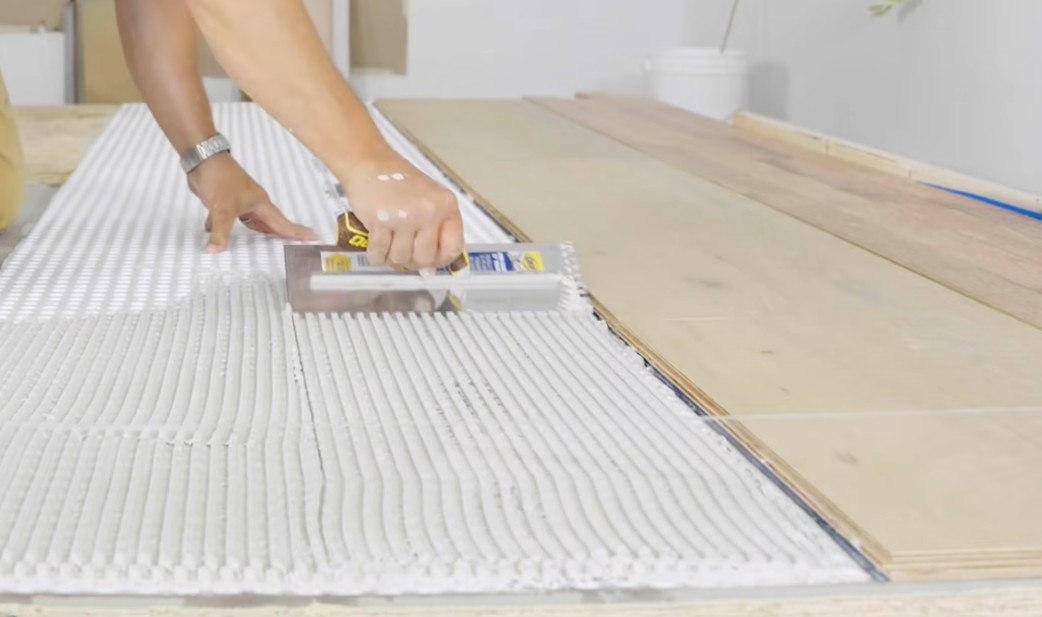 Zubatou stěrkou roztírá lepicí maltu na podklad, čímž vytváří rovnoměrné drážky, které zajistí správné přilnutí dlažby k podlaze