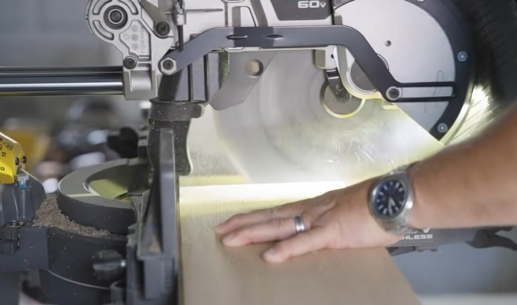 Pomocí pokosové pily řeže dřevěné prkno na přesnou délku, aby jednotlivé díly podlahy do sebe správně zapadly při pokládce