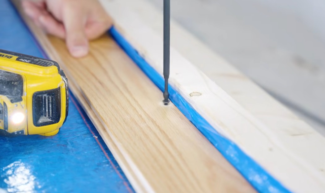 Pomocí akušroubováku upevňuje první řadu dřevěných prken k podkladu, aby se během pokládky dalších dílů nepohnula a zůstala přesně v jedné linii